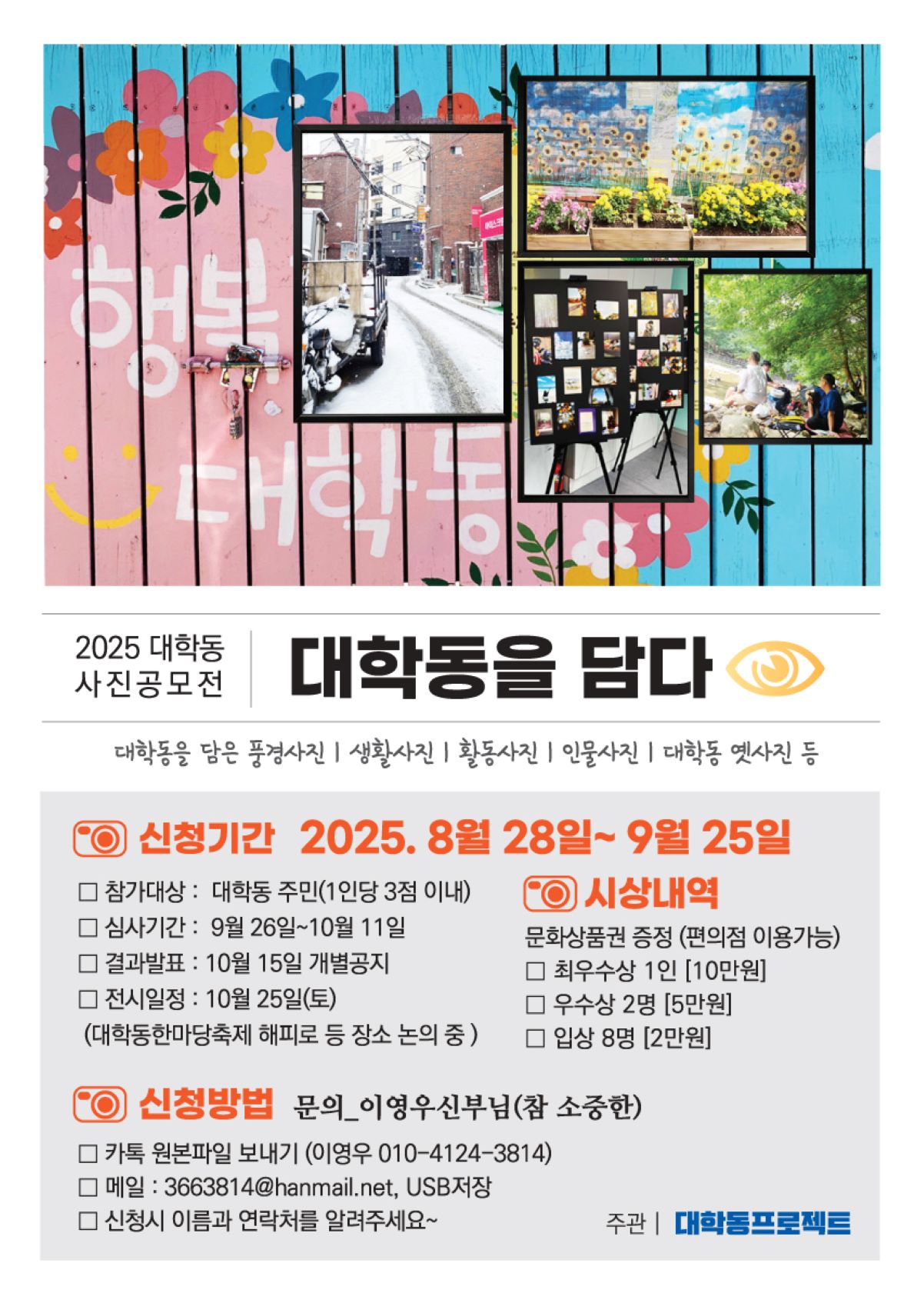✅ 관악사회복지가 함께 하고 있는 '대학동프로젝트'에서 올해 두 번째 대학동한마당축제를 10월25일(토)에 준비하고 있습니다. 동네 주민들의 참여를 유도하고 대학동한마당축제를 더욱 풍성하게 준비하고자 사진공모전을 진행합니다. 대학동의 일상을 담은 사진으로 스토리가 담기면 더욱 좋습니다. 지금 한 번 도전해보시겠습니까?
