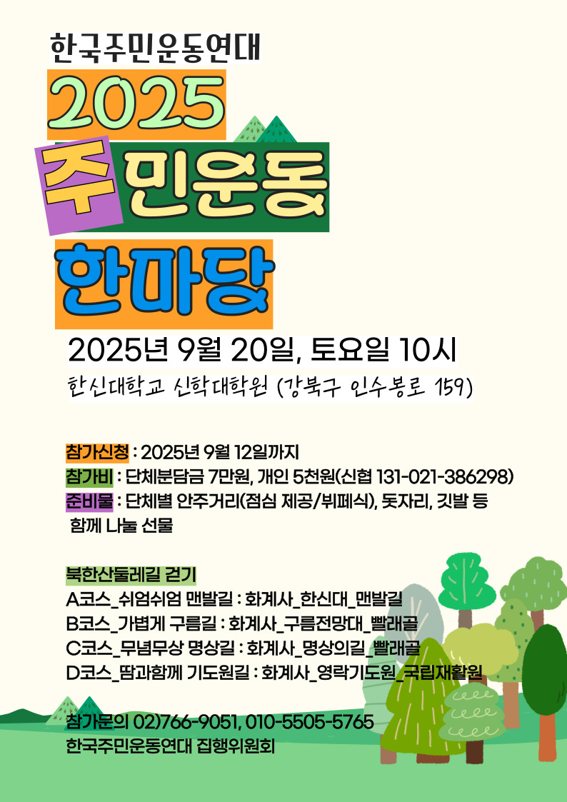 ✅ 주민운동은 다양한 현장에서 일어나고 있습니다. 다양한 현장에서 활동하는 주민조직이 한 자리에 모여 서로 지지하고 응원하는 연대의 장!! 주민운동한마당 행사가 올해는 예년보다 조금 빠르게 9월에 열립니다. 10월, 긴 연휴로 인해 9월20일(토)에 강북구 수유동 한신대학교 신학대학원에서 진행되며, 관악사회복지도 참여합니다.