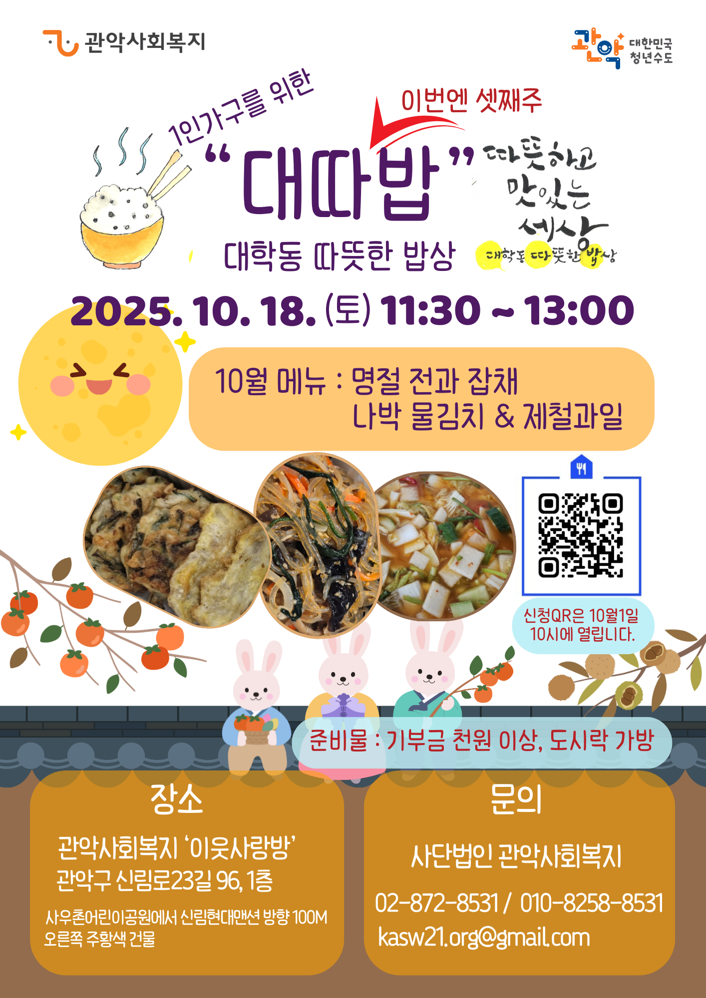 ✅ 10월 대따밥은 추석명절이 끝난 후 만납니다. 그래서 명절과 연관있는 메뉴로 구성하였습니다. 이번에 인기가 많을 것으로 예상이 되어 조금 더 많이 준비를 하였습니다. 11월 대따밥 일정은 8일에 진행되며, 올해 마지막 대따밥이니 참고해주시면 감사하겠습니다.