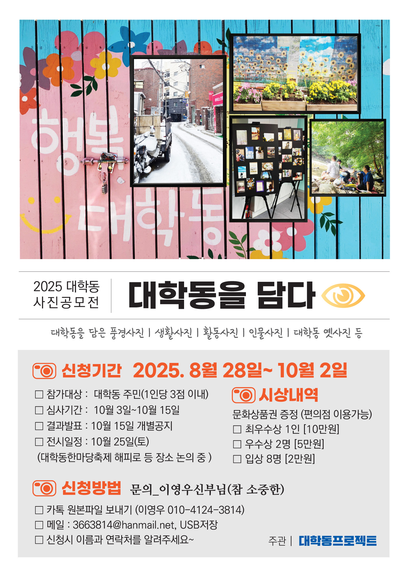✅ 관악사회복지가 함께 하고 있는 '대학동프로젝트'에서 준비하고 있는 '대학동한마당축제'가 10월25일(토) 오후2시부터 선민교회 일대에서 진행됩니다. 동네 주민들의 참여를 유도하고, 대학동한마당축제를 더욱 풍성하게 준비하고자 사진공모전 신청기간을 연장하였습니다. 많은 참여를 부탁드리며, 10월25일 축제에도 많이 놀러오세요♡