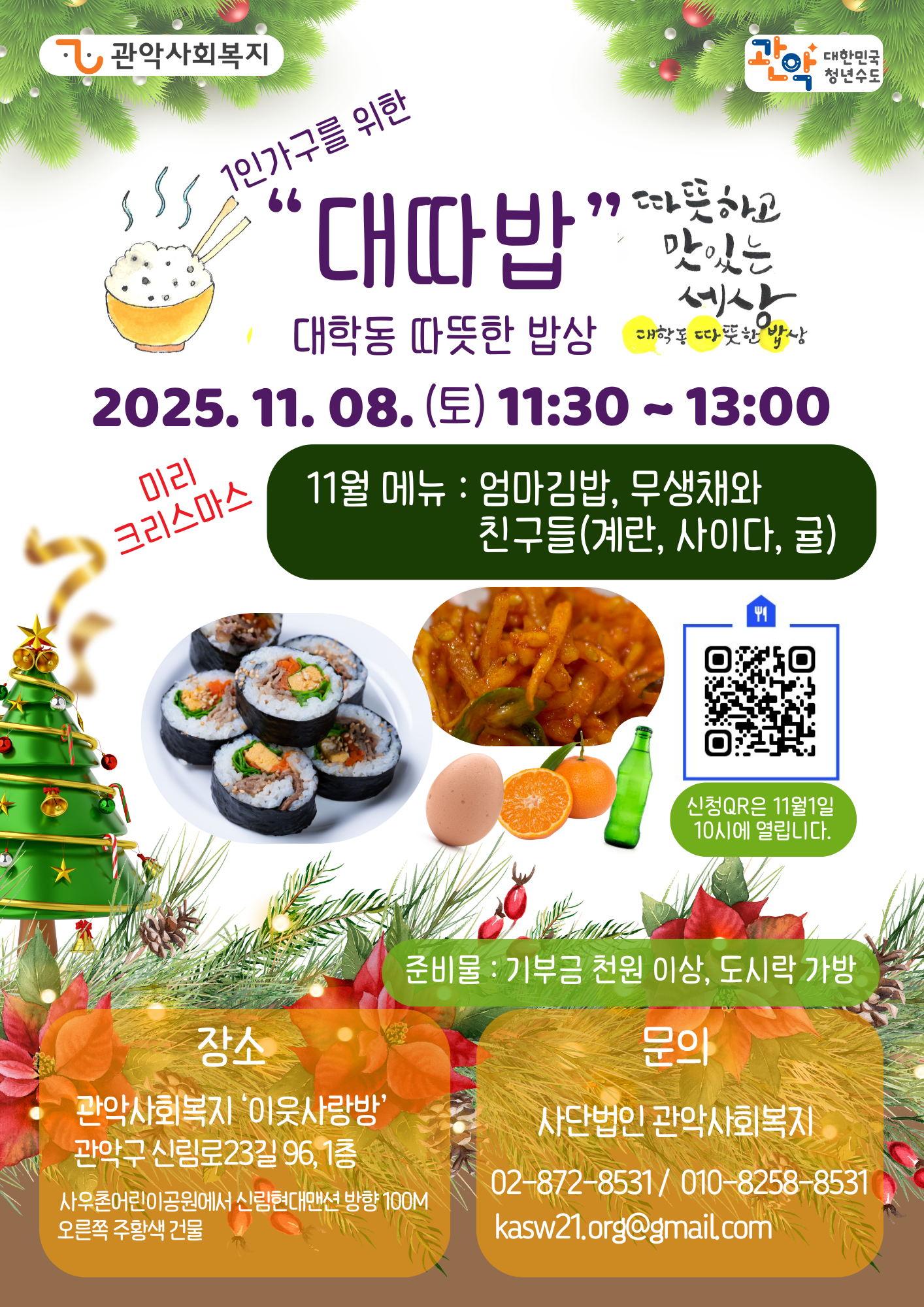 ✅ 대학동따뜻한밥상, 대따밥이란 이름으로 올해를 시작하였는데 어느 덧 올해 마지막 6회차를 앞두고 있습니다. 마지막을 장식할 메뉴는 엄마표 김밥입니다. 김밥은 언제 먹어도 맛이 있지요. 김밥만 먹기에는 아쉬우니 사이다와 삶은 달걀도 준비했어요. 아쉽게도 예약은 끝났습니다. 마지막까지 정성을 다해서 준비하겠습니다.