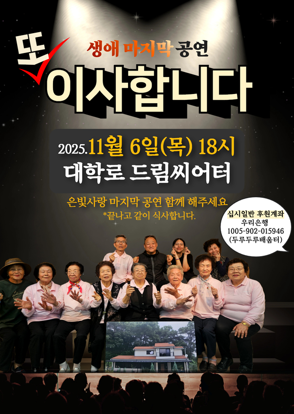 ✅ 은빛사랑 어르신들이 매년 연극을 꾸준히 해오셨는데, 97세, 94세, 88세, 87세 ... 아마도 마지막 공연이지 않을까 싶어요. 은빛사랑 마지막 공연에 함께 해주세요. 이 노인들에게 감동받을 기회, 밥 살 기회 아직 있어요~ 연극 끝나고 저녁 식사도 있습니다.