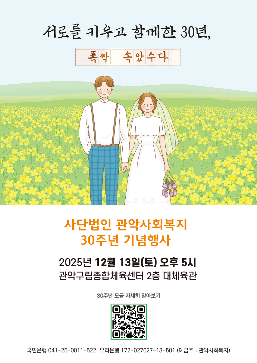 ✅ 새로운 저희 발걸음, 그 시작점을 ‘결혼식’이라는 형식에 담아봤습니다. 다소 엉뚱한 생각이지만 다음을 준비하는 마음을 담고자 했습니다. 새로운 관계 맺음을 위해 서로를 충분히 더 알아가고, 함께할 방향을 토론하고, 설레는 마음으로 많은 사람들 앞에서 그 약속을 찬찬히 이야기 하는 시간이 되기를 바랍니다. 특별한 30주년 기념식에 함께 해주시겠어요? - 이주희 관악사회복지 이사장