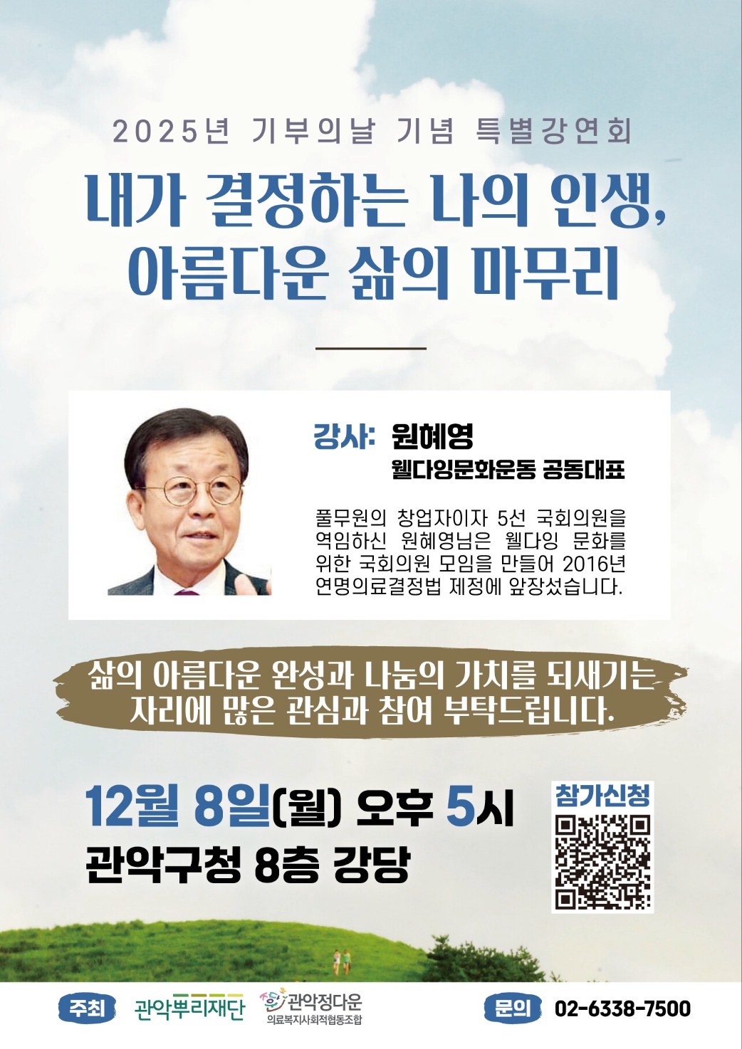 ✅ 2024년 우리 사회의 성숙한 기부 문화 확산을 위해 '기부의 날'이 처음 제정되었습니다. 12월 8일, 기부의 날을 기념하며 특별 강연회에 여러분을 초대합니다. "내가 결정하는 나의 인생, 아름다운 삶의 마무리", 풀무원 창업자이자 '연명의료결정법' 제정을 이끈 원혜영 웰다잉문화운동 공동대표를 모시고 존엄한 삶의 완성, 그리고 그 안에 담긴 '나눔'의 진정한 가치를 되새겨봅니다.